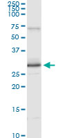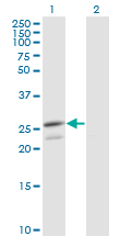 Western Blot analysis of PRDX3 expression in transfected 293T cell line by PRDX3 monoclonal antibody (M01), clone 1E3-B2. Lane 1: PRDX3 transfected lysate (Predicted MW: 27.7 KDa). Lane 2: Non-transfected lysate.