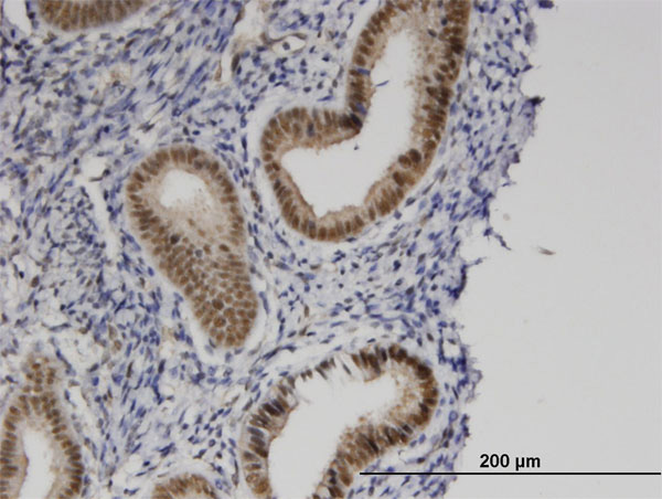 Immunoperoxidase of monoclonal antibody to ZMYND8 on formalin-fixed paraffin-embedded human endometrium. [antibody concentration 0.25 ug/ml] |