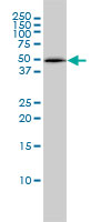 Western Blot analysis of PSMC4 expression in transfected 293T cell line by PSMC4 monoclonal antibody (M01), clone 3G8. Lane 1: PSMC4 transfected lysate(47.4 KDa). Lane 2: Non-transfected lysate. |