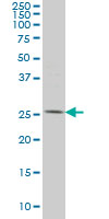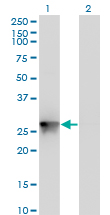 Western Blot analysis of PYCRL expression in transfected 293T cell line by PYCRL monoclonal antibody (M01), clone 4F11. Lane 1: PYCRL transfected lysate (Predicted MW: 28.6 KDa). Lane 2: Non-transfected lysate. |