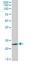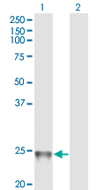 Western Blot analysis of RAB1B expression in transfected 293T cell line by RAB1B monoclonal antibody (M02), clone 1B2. Lane 1: RAB1B transfected lysate(22.2 KDa). Lane 2: Non-transfected lysate. |