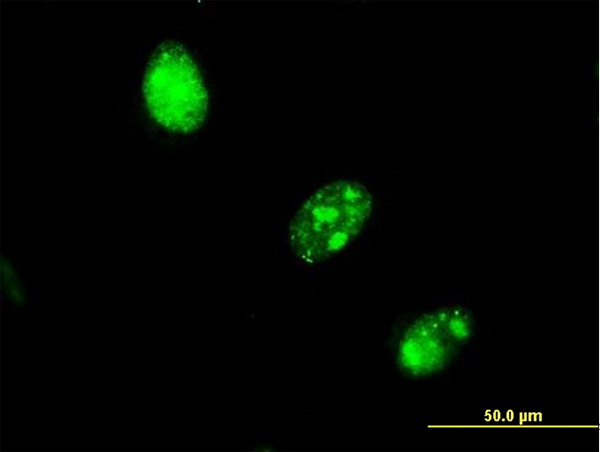 Immunofluorescence of monoclonal antibody to RBAF600 on HeLa cell. [antibody concentration 10 ug/ml]