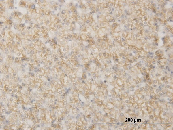 Immunoperoxidase of monoclonal antibody to RBP4 on formalin-fixed paraffin-embedded human liver. [antibody concentration 2 ug/ml] |