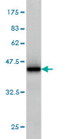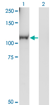 Western Blot analysis of RGL1 expression in transfected 293T cell line by RGL1 monoclonal antibody (M01), clone 2D10. Lane 1: RGL1 transfected lysate(90.7 KDa). Lane 2: Non-transfected lysate. |
