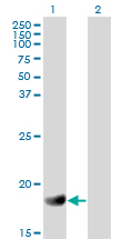 Western Blot analysis of RGS3 expression in transfected 293T cell line by RGS3 monoclonal antibody (M01), clone 1E8-C7. Lane 1: RGS3 transfected lysate(19.5 KDa). Lane 2: Non-transfected lysate.