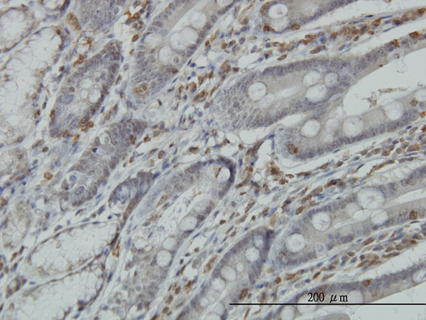 Immunoperoxidase of monoclonal antibody to RGS3 on formalin-fixed paraffin-embedded human small Intestine. [antibody concentration 3 ug/ml] |
