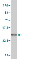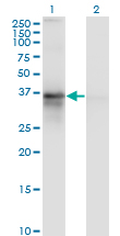 Western Blot analysis of RP2 expression in transfected 293T cell line by RP2 monoclonal antibody (M02), clone 5C10. Lane 1: RP2 transfected lysate(39.6 KDa). Lane 2: Non-transfected lysate. |