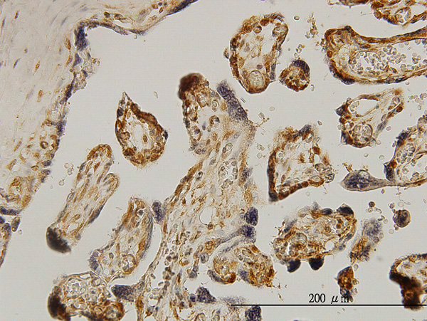 Immunoperoxidase of monoclonal antibody to RPS6KB1 on formalin-fixed paraffin-embedded human placenta. [antibody concentration 0.5 ug/ml] |