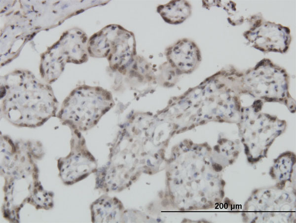 Immunoperoxidase of monoclonal antibody to S100A11 on formalin-fixed paraffin-embedded human placenta. [antibody concentration 3 ug/ml]