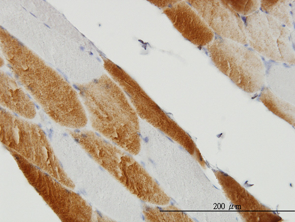 Immunoperoxidase of monoclonal antibody to SDHC on formalin-fixed paraffin-embedded human skeletal muscle. [antibody concentration 3 ug/ml] |
