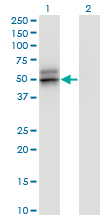 Western Blot analysis of SERPINA12 expression in transfected 293T cell line by SERPINA12 monoclonal antibody (M01), clone 3B3. Lane 1: SERPINA12 transfected lysate(47.2 KDa). Lane 2: Non-transfected lysate.