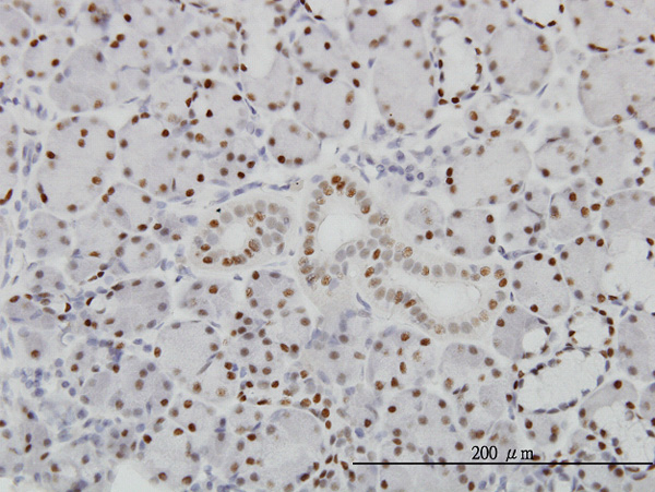 Immunoperoxidase of monoclonal antibody to PBX1 on formalin-fixed paraffin-embedded human salivary gland. [antibody concentration 3 ug/ml] |