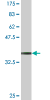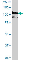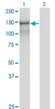Western Blot analysis of PCDH10 expression in transfected 293T cell line by PCDH10 monoclonal antibody (M07), clone 2H6. Lane 1: PCDH10 transfected lysate(112.9 KDa). Lane 2: Non-transfected lysate. |