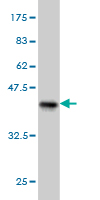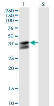 Western Blot analysis of PDHB expression in transfected 293T cell line by PDHB monoclonal antibody (M03), clone 2B2. Lane 1: PDHB transfected lysate(39.2 KDa). Lane 2: Non-transfected lysate. |