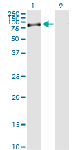 Western Blot analysis of RASGRP2 expression in transfected 293T cell line by RASGRP2 monoclonal antibody (M09), clone 3D8. Lane 1: RASGRP2 transfected lysate(75.5 KDa). Lane 2: Non-transfected lysate.