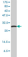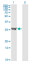 Western Blot analysis of SFN expression in transfected 293T cell line by SFN monoclonal antibody (M01), clone 3C3. Lane 1: SFN transfected lysate(27.8 KDa). Lane 2: Non-transfected lysate. |