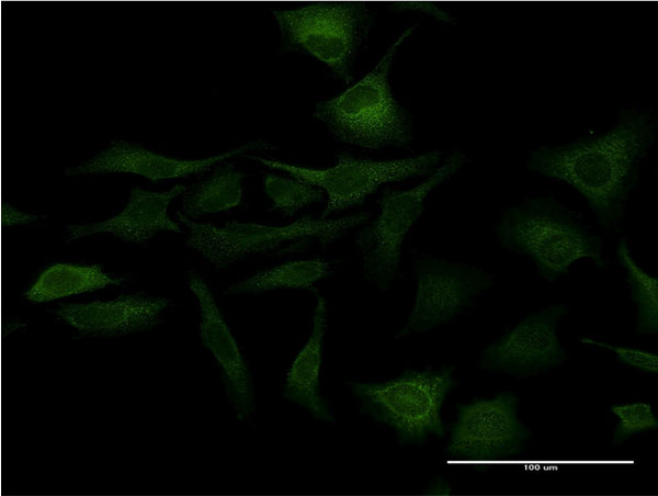 Immunofluorescence of monoclonal antibody to SFN on HeLa cell . [antibody concentration 10 ug/ml] |
