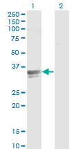 Western Blot analysis of SFXN3 expression in transfected 293T cell line by SFXN3 monoclonal antibody (M01), clone 4A3. Lane 1: SFXN3 transfected lysate (Predicted MW: 35.5 KDa). Lane 2: Non-transfected lysate. |