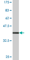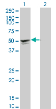 Western Blot analysis of SGCA expression in transfected 293T cell line by SGCA monoclonal antibody (M01), clone 3C4. Lane 1: SGCA transfected lysate(42.9 KDa). Lane 2: Non-transfected lysate.
