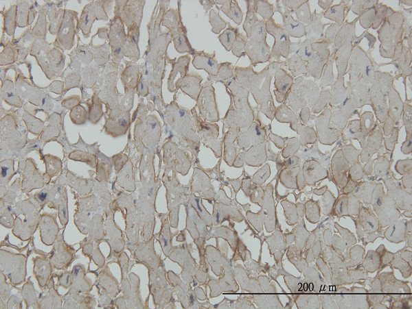 Immunoperoxidase of monoclonal antibody to SGCB on formalin-fixed paraffin-embedded human heart. [antibody concentration 3 ug/ml] |