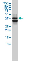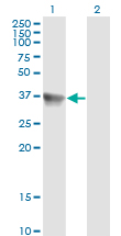 Western Blot analysis of SH3GLB1 expression in transfected 293T cell line by SH3GLB1 monoclonal antibody (M01), clone 1B3-A5. Lane 1: SH3GLB1 transfected lysate(40.8 KDa). Lane 2: Non-transfected lysate. |