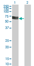 Western Blot analysis of SH3PX3 expression in transfected 293T cell line by SH3PX3 monoclonal antibody (M03), clone 3A1. Lane 1: SH3PX3 transfected lysate(65.265 KDa). Lane 2: Non-transfected lysate. |