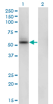 Western Blot analysis of SHMT1 expression in transfected 293T cell line by SHMT1 monoclonal antibody (M01), clone 4F9. Lane 1: SHMT1 transfected lysate(53.1 KDa). Lane 2: Non-transfected lysate. |