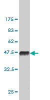 Western Blot analysis of SIRT2 expression in transfected 293T cell line by SIRT2 monoclonal antibody (M01), clone 4B11. Lane 1: SIRT2 transfected lysate(39.5 KDa). Lane 2: Non-transfected lysate.