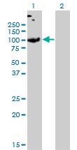 Western Blot analysis of SLC26A2 expression in transfected 293T cell line by SLC26A2 monoclonal antibody (M04), clone 3F6. Lane 1: SLC26A2 transfected lysate(81.6 KDa). Lane 2: Non-transfected lysate.