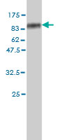 Western Blot analysis of SLC4A4 expression in transfected 293T cell line by SLC4A4 monoclonal antibody (M01), clone 1G2. Lane 1: SLC4A4 transfected lysate (Predicted MW: 72 KDa). Lane 2: Non-transfected lysate.