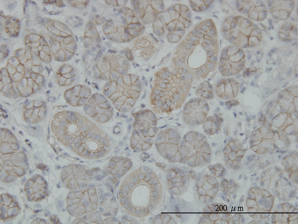 Immunoperoxidase of monoclonal antibody to SLC4A8 on formalin-fixed paraffin-embedded human salivary gland. [antibody concentration 3 ug/ml]