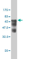 Western Blot analysis of SMS expression in transfected 293T cell line by SMS monoclonal antibody (M01), clone 1G6. Lane 1: SMS transfected lysate(41.268 KDa). Lane 2: Non-transfected lysate.