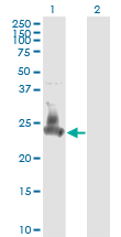 Western Blot analysis of SNAP23 expression in transfected 293T cell line by SNAP23 monoclonal antibody (M01), clone 2F5-3D4. Lane 1: SNAP23 transfected lysate (Predicted MW: 23.4 KDa). Lane 2: Non-transfected lysate.
