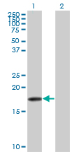 Western Blot analysis of SNCB expression in transfected 293T cell line by SNCB monoclonal antibody (M07), clone 3H4. Lane 1: SNCB transfected lysate(14.3 KDa). Lane 2: Non-transfected lysate.