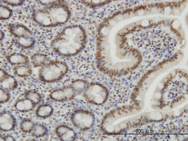 Immunoperoxidase of monoclonal antibody to SP1 on formalin-fixed paraffin-embedded human small Intestine. [antibody concentration 3 ug/ml] |