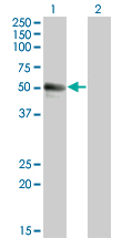 Western Blot analysis of SPN expression in transfected 293T cell line by SPN monoclonal antibody (M01), clone 3G8. Lane 1: SPN transfected lysate(59.327 KDa). Lane 2: Non-transfected lysate.
