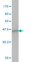 Western Blot analysis of SPRY1 expression in transfected 293T cell line by SPRY1 monoclonal antibody (M01), clone 3H4. Lane 1: SPRY1 transfected lysate(35.1 KDa). Lane 2: Non-transfected lysate. |
