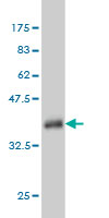 Western Blot analysis of SSH3 expression in transfected 293T cell line by SSH3 monoclonal antibody (M01), clone 6F9. Lane 1: SSH3 transfected lysate(73 KDa). Lane 2: Non-transfected lysate. |