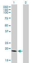 Western Blot analysis of SSR4 expression in transfected 293T cell line by SSR4 monoclonal antibody (M01), clone 2D3. Lane 1: SSR4 transfected lysate(19 KDa). Lane 2: Non-transfected lysate. |