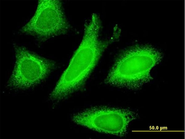 Immunofluorescence of monoclonal antibody to STAU1 on HeLa cell . [antibody concentration 10 ug/ml]