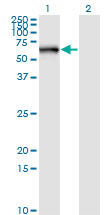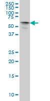 Western Blot analysis of STK33 expression in transfected 293T cell line by STK33 monoclonal antibody (M03), clone 4A12. Lane 1: STK33 transfected lysate(57.9 KDa). Lane 2: Non-transfected lysate. |