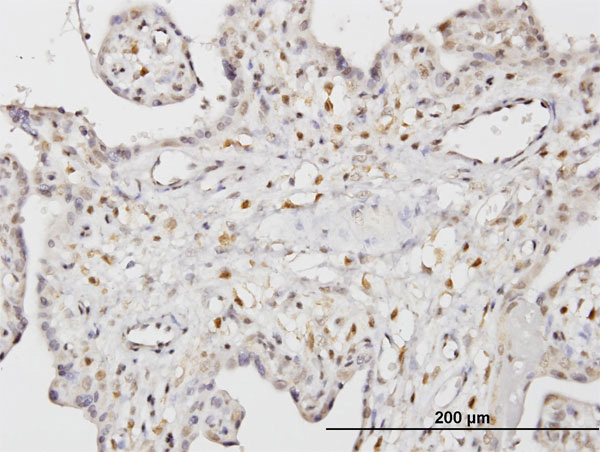 Immunoperoxidase of monoclonal antibody to STK33 on formalin-fixed paraffin-embedded human placenta. [antibody concentration 1.5 ug/ml] |