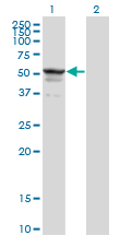 Western Blot analysis of SYMPK expression in transfected 293T cell line by SYMPK monoclonal antibody (M03), clone 4C2. Lane 1: SYMPK transfected lysate(58.9 KDa). Lane 2: Non-transfected lysate.