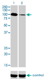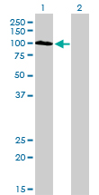 Western Blot analysis of SYNJ2 expression in transfected 293T cell line by SYNJ2 monoclonal antibody (M02), clone 2H8. Lane 1: SYNJ2 transfected lysate(92.2 KDa). Lane 2: Non-transfected lysate.