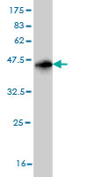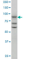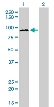 Western Blot analysis of TAX1BP1 expression in transfected 293T cell line by TAX1BP1 monoclonal antibody (M01), clone 2C3. Lane 1: TAX1BP1 transfected lysate(90.9 KDa). Lane 2: Non-transfected lysate. |