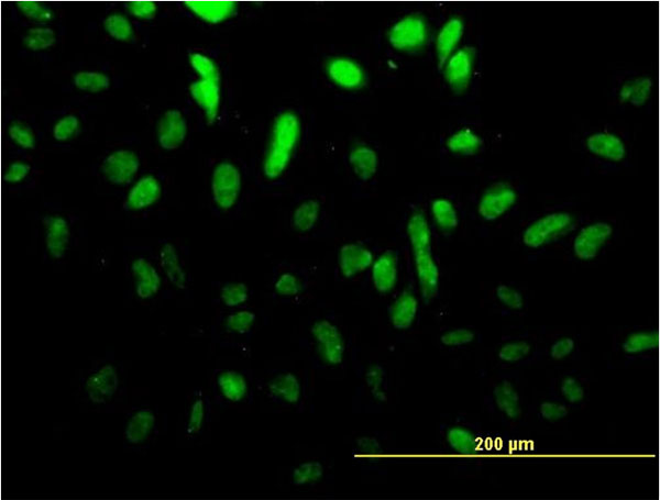 Immunofluorescence of monoclonal antibody to TCF4 on HeLa cell. [antibody concentration 10 ug/ml] |