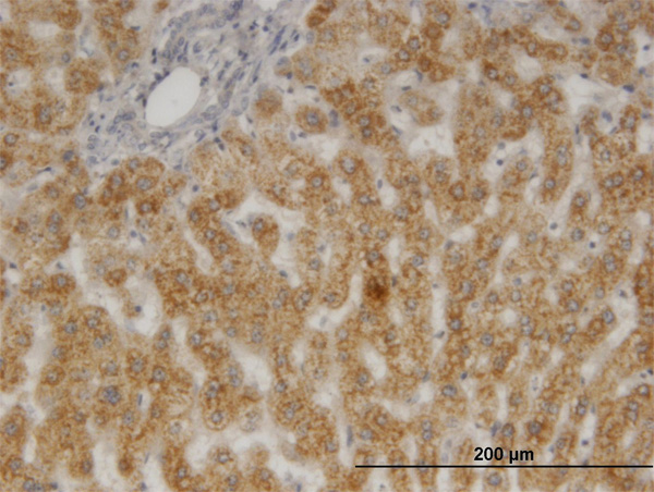 Immunoperoxidase of monoclonal antibody to PTGES3 on formalin-fixed paraffin-embedded human liver. [antibody concentration 3 ug/ml] |