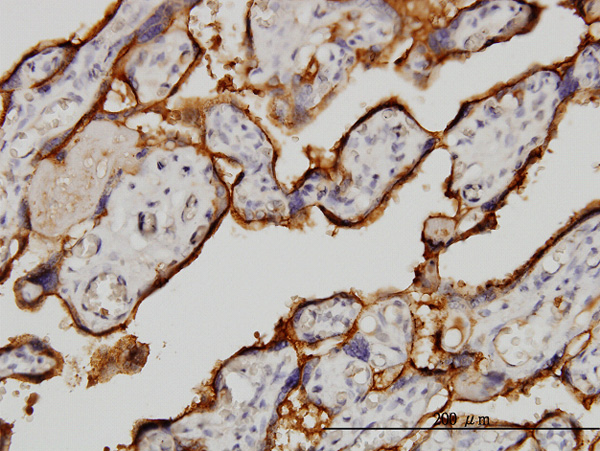 Immunoperoxidase of monoclonal antibody to TFRC on formalin-fixed paraffin-embedded human placenta. [antibody concentration 1 ug/ml] |