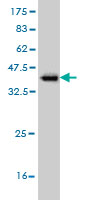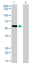 Western Blot analysis of TOM1 expression in transfected 293T cell line by TOM1 monoclonal antibody (M01), clone 5A3. Lane 1: TOM1 transfected lysate(53.8 KDa). Lane 2: Non-transfected lysate. |