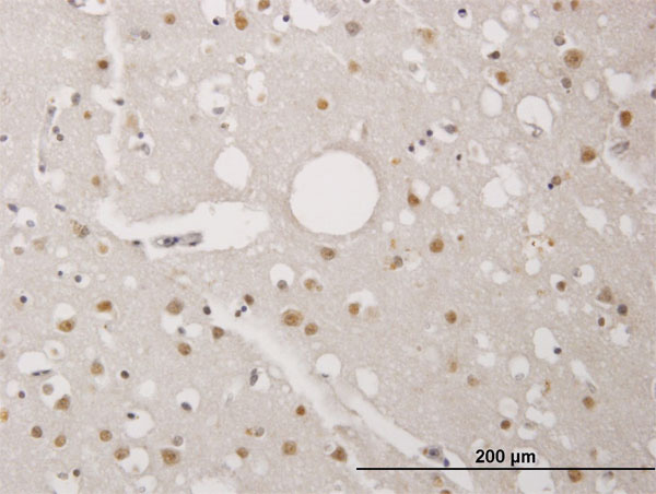 Immunoperoxidase of monoclonal antibody to TP53RK on formalin-fixed paraffin-embedded human cerebral cortex. [antibody concentration 3 ug/ml]